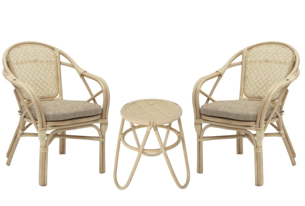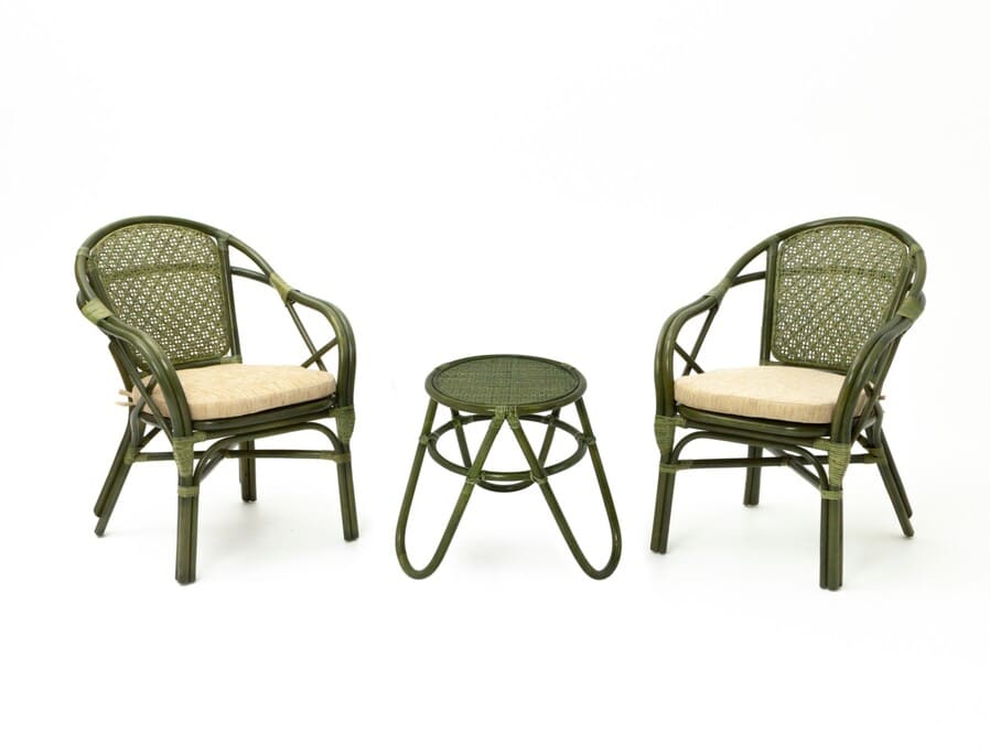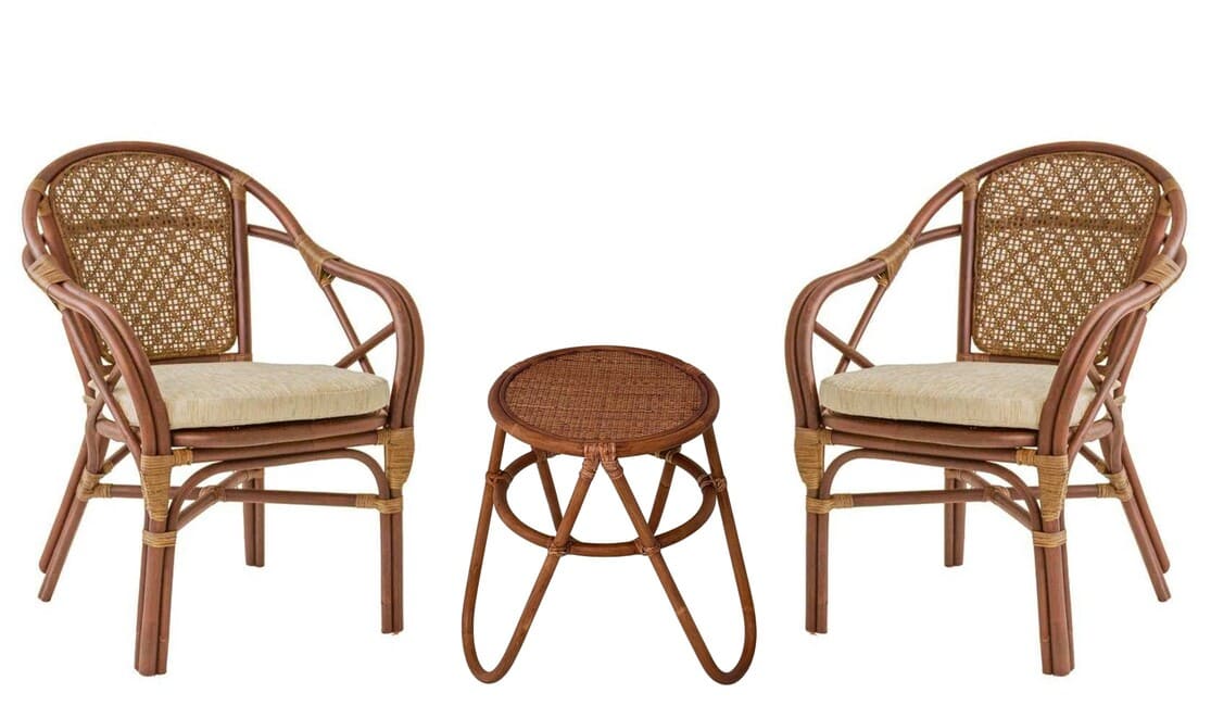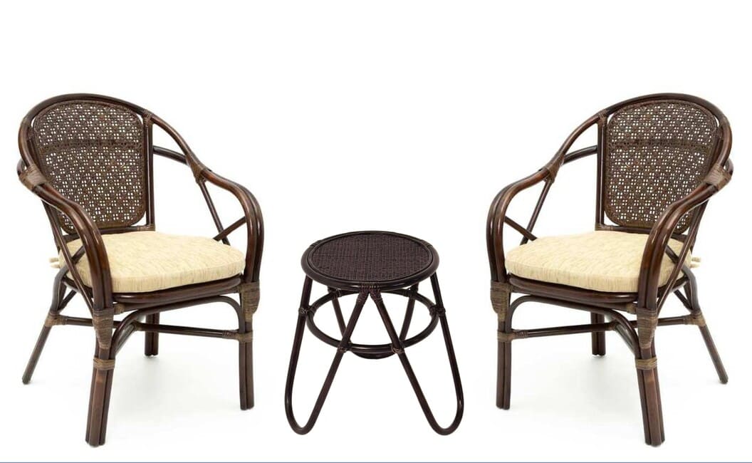 Компактный кофейный комплект из натурального ротанга класса А включает в себя столик Киви диаметром 45 см и два кресла Петани с красивой плетеной спинкой.