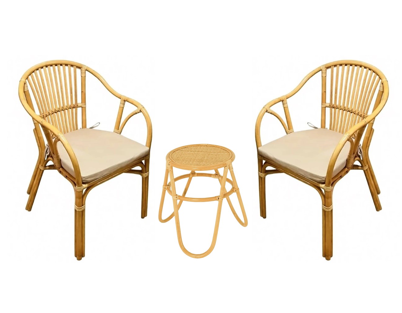 Компактный кофейный комплект из натурального ротанга класса А включает в себя столик диаметром 45 см и два кресла Киви.