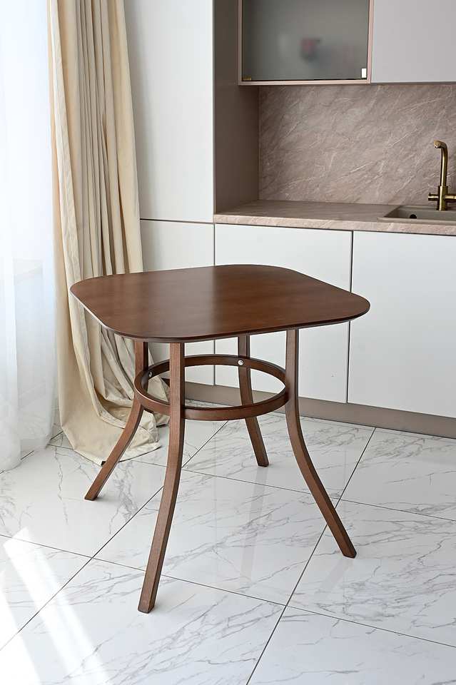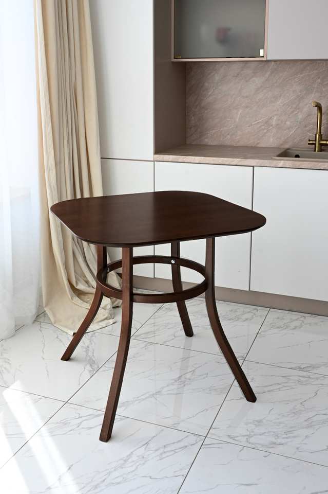 Продуманная конструкция сочетает прочность гнутого деревянного каркаса из бука с износостойким покрытием, представленным комбинацией материалов: верхняя и нижняя поверхности столешницы выполнены из качественного материала — многослойного МДФ, покрытого двумя слоями натурального шпона бука. Это решение обеспечивает надежность и долговечность даже при интенсивном использовании.