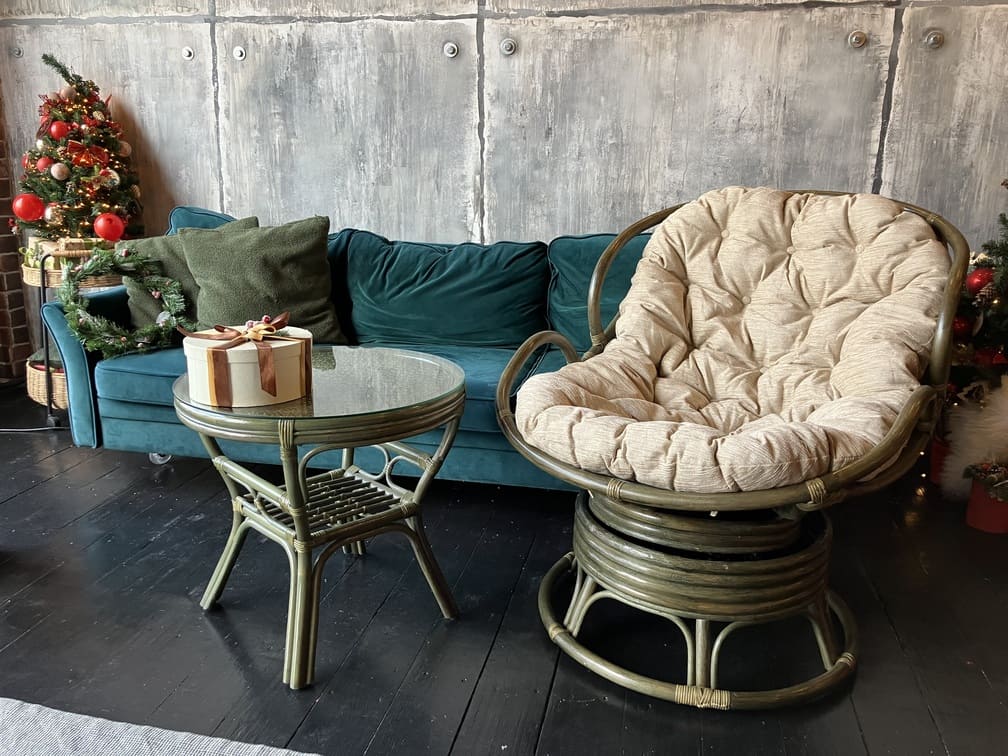 Кресло из натурального ротанга в цвете олива.